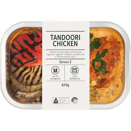 Chicken Thigh (32%), Greek Yoghurt (Milk), Eggplant, Red Capsicum, Chickpeas, Sweet Potato, Tandoori Paste (3.5%) (Water, Grapeseed Oil, Durum Wheat Semolina, Salt, Sugar, Acid (Acetic Acid), Colour (Paprika Extract), Ginger Puree, Cumin, Chilli Powder, Ground Mustard, Ground Ginger, Coriander, Cinnamon, Paprika, Garlic Powder, Spices, Acid (Citric Acid), Onion Powder, Ground Celery, Stabilisers (Guar Gum, Xanthan Gum)), Onion, Lemon Juice, Olive Oil, Vegetable Oil, Salt, Corn Starch, Chicken Stock, Parsley, White Pepper, Acidity Regulator (Citric Acid).