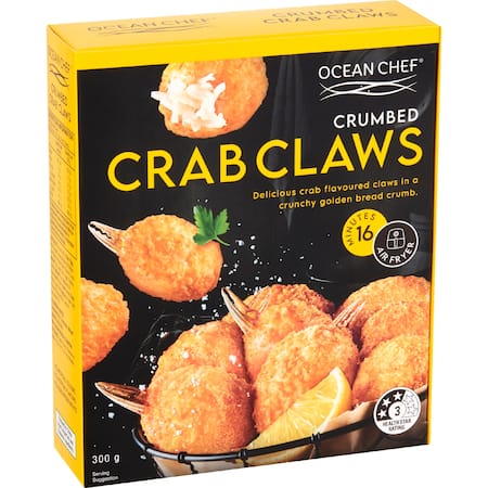 Surimi (60%) (Fish, Egg White, Sugar, Polyphosphate 452), Water, Corn Starch, Potato Starch, Bread Crumb (Wheat Flour, Yeast, Salt, Sugar, Paprika Extract), Wheat Flour, Soybean Oil, Sugar, Crab Pincers, Crab Extract (Crab, Water, Sugar, Salt), Soybean Protein, Salt, Flavour Enhancer (635), CalciumCarbonate (170).