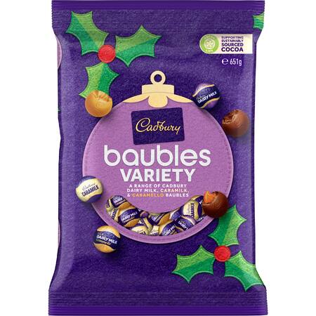 DAIRY MILK MILK CHOCOLATE BAUBLESINGREDIENTS: FULL CREAM MILK, SUGAR, COCOA BUTTER, COCOA MASS, MILK SOLIDS, EMULSIFIERS (SOY LECITHIN, 476), FLAVOURS.CONTAINS MILK, SOY.MAY CONTAIN PEANUTS, TREE NUTS.MILK CHOCOLATE CONTAINS COCOA SOLIDS 28%, MILK SOLIDS MINIMUM 24%CARAMILK BAUBLESINGREDIENTS: FULL CREAM MILK, SUGAR, COCOA BUTTER, MILK SOLIDS, EMULSIFIERS (SOY LECITHIN, 476), FLAVOUR.CONTAINS MILK, SOY.MAY CONTAIN PEANUTS, TREE NUTS.WHITE CHOCOLATE CONTAINS COCOA SOLIDS 23%, MILK SOLIDS 29%CARAMELLO BAUBLESPRODUCT CONTAINS MILK CHOCOLATE (75%), CARAMEL (25%).INGREDIENTS: FULL CREAM MILK, SUGAR, GLUCOSE SYRUP, COCOA BUTTER, COCOA MASS, MILK SOLIDS, SWEETENED CONDENSED MILK, VEGETABLE FAT, INVERT SUGAR, EMULSIFIERS (SOY LECITHIN, 476, 471), ACIDITY REGULATOR (331), FLAVOURS, SALT.CONTAINS MILK, SOY.MAY CONTAIN PEANUTS, TREE NUTS.MILK CHOCOLATE CONTAINS COCOA SOLIDS 28%, MILK SOLIDS MINIMUM 24%