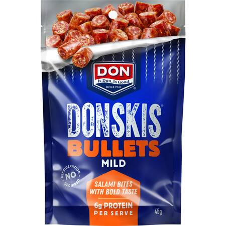 Ready to EatDON DONSKIS Mild Salami Bullets are ideal for snacking on-the-go, or on grazing boards for easy entertaining. With a bold flavour, these bites pair perfectly with hard cheeses.