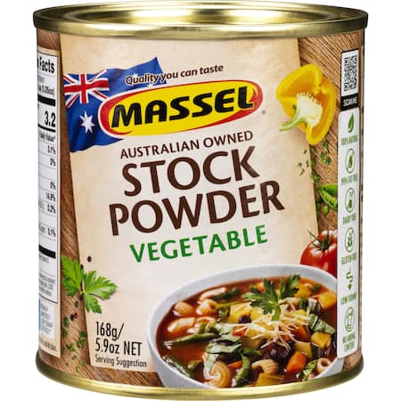 Sea Salt from the Southern Ocean, Low Sugar Maize Maltodextrin, Natural Vegetable Flavour, Yeast Ext ract, Cane Sugar, Dehydrated Vegetables (Spinach, Celery, Cabbage), Canola Oil, Extra Virgin Olive O il, Cane Sugar, Potassium Chloride, Parsley.