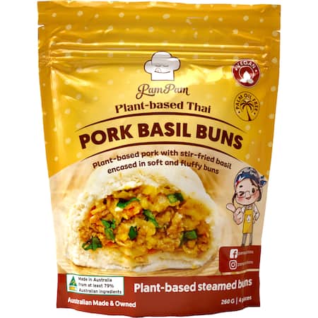 Dough (55%) (Wheat flour, wholewheat flour, rice bran oil, sugar, salt, baking powder, yeast), Filling (45%) Plant-based mince (water, vegetable protein (soy) (23%), vegetable oil, thickeners (methylcellulose, guar gum), yeast extract, natural flavour, sea salt and spice, cabbage, carrot, onion, soysauce, mushroom sauce, rice bran oil, basil, garlic, sugar, cornflour, chilli, sesame oil