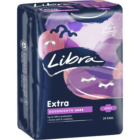 Embrace a goodnight's sleep with Libra Extra Goodnights Pads with Wings. With up to 12 hours of protection, they feature an extra thick yet soft layer, delivering both comfort and security when you need it most. Carefully designed with a unique BodyFit shape that moulds to your body for comfort like a second skin, and curved wings that keep the pad securely in place throughout the night. Our Extra's range helps you to handle the heaviest of flows with ease. The high absorbency is complemented by extra length, providing extra coverage in any sleeping position. Libra Extra Goodnights Pads are more than just a bedtime essential; they're a cushiony piece of comfort so that you can sleep well and face the day with confidence.