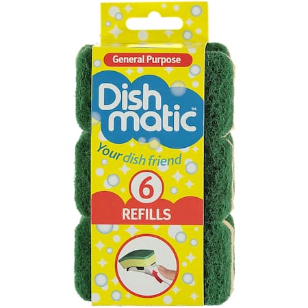 Do not use on delicate or non scratch surfaces.Dishmatic General Purpose Refills 6 pack Dishmatic is the original dispensing fillable and refillable washing up tool. Dishmatic - Your dish friend. Stunningly simple and fantastically effective, Dishmatic is an essential aid to dishwashing that?s loved by everyone who uses it. Dishmatic General Purpose Refills are ideal for all general purpose washing up. They have been treated with our anti-bacterial agent to prevent the growth of bacteria. When the sponge wears out simply unclip it and replace with a new Dishmatic Refill. Do not use on delicate or non stick surfaces. All Dishmatic refills are interchangeable and all sponge heads are treated with our anti-bacterial agent.