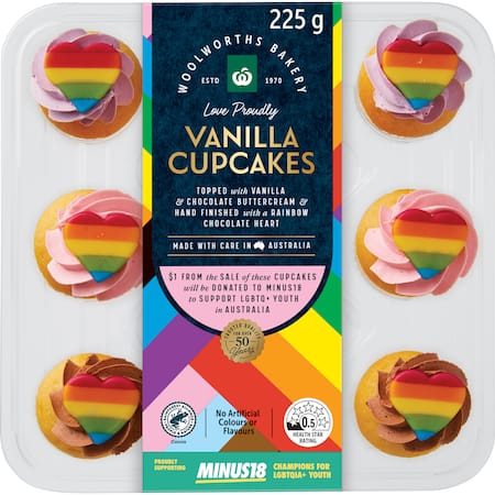 Cupcake (80%) (Wheat Flour, Sugar, Egg, Canola Oil, Water, Iodised Salt, Thickener (1422), Natural Vanilla Flavour, Raising Agents (541, 450, Sodium Bicarbonate), Mineral Salt (Calcium Carbonate), Preservative (Potassium Sorbate), Acidity Regulator (Citric Acid)), Icing (19%) (Unsalted Butter (Milk), Icing Sugar, Water, Cocoa Powder (1), Natural Colours (Beet Red, Carmines) Humectant (422), Emulsifier (Soy Lecithin), Natural Vanilla Flavour), Chocolate Figurines (1%) (Sugar, Cocoa Butter (1), Whole Milk Powder, Lactose (Milk), Skimmed Milk Powder, Emulsifiers (Soy Lecithin, 492), Natural Colours (Anthocyanins, Riboflavin), Spirulina, Natural Vanilla Flavour, Palm Oil (476).