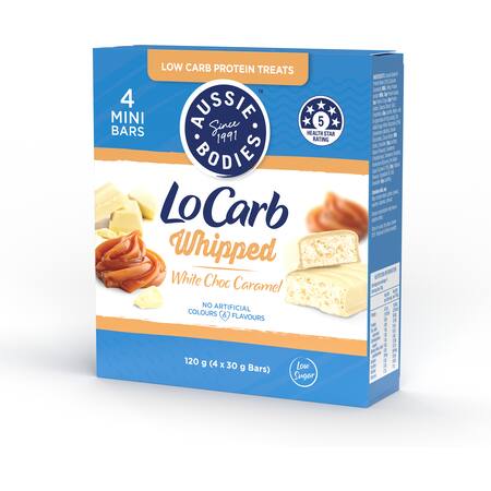Aussie Bodies Protein Blend (31%) Calcium Caseinate (Milk), Whey Protein Isolate (Milk), Soy Protein Isolate, Soy Protein Crisps (Soy Protein Isolate, Tapioca Starch, Salt), Emulsifiers (Soy Lecithin, Mono- and Di-glycerides of Fatty acids), No Added Sugar White Chocolate (25%) (Sweeteners (Maltitol, Steviol Glycosides), Cocoa Butter, Milk Solids, Emulsifier (Soy Lecithin), Natural Flavours), Sweetener (Polydextrose), Sweetener (Sorbitol), Humectant (Glycerol), No Added Sugar Caramel (1.8%) (Soy), Natural Flavours, Vegetable Oil, Salt, Emulsifier (Soy Lecithin).