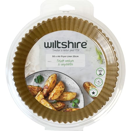 Cooking with heat requires attention & care. Please refer to the safety and user manual for your specific machine before use. Always place food on the liner before starting the air fryer. Do not use the liner without food to weigh it down, as it may fly iIntroducing the Wiltshire Air Fryer Liners, the perfect addition to your air frying game. Say goodbye to messy and time-consuming clean-ups and hello to quick and easy cooking with these revolutionary air frying papers. These papers are specially designed to fit most air fryer baskets and allow for healthier cooking by reducing the need for added oils or fats. Simply place the paper in the air fryer basket, add your favourite foods, and let the air fryer do its magic. Once you're done, just dispose of the paper and enjoy your delicious meal. The pack of 50 ensures that you have plenty of papers for all your cooking needs, and they come conveniently packaged for easy storage. The papers are made from high-quality, food-grade materials that are safe for cooking. They are also heat-resistant, making them ideal for high-temperature cooking. - Pack of 50 disposable liners - Round Shape - 20 x 20 x 5cm