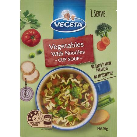Noodles 43.8% (Durum Wheat Semolina, Salt), Dried Vegetables 15.2% (Celery, Carrot, Potato, Green Peas, Leek, Onion, Tomato, Broccoli), Salt, Sugar, Potato Starch, Maltodextrin, Vegetable Oil, Yeast Extract, Spices, Flavourings, Parsley Leaves