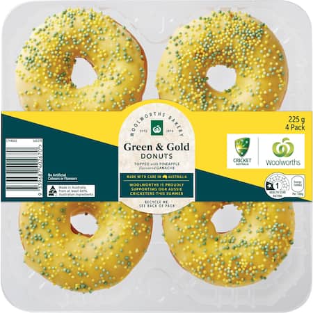 Donut (Wheat Flour, Water, Vegetable Oils (Palm, Soy (Antioxidant (307)), Dextrose, Yeast, Salt, Emulsifiers (471, 481, 472e) (Palm), Soy Flour, Raising Agents (541, 500), Milk Solids, Vegetable Gum (Pectin), Processing Aid (Wheat)), Pineapple Flavoured Ganache (20%) (White Compound Choc (Sugar, Vegetable Fat (Palm), Milk Solids, Emulsifier (322 (Soy)), Salt, Natural Flavour), Thickened Cream (Cream (Milk), Beef Gelatine), Vegetable Shortening (Palm Oil, Emulsifiers (435, 471), Antioxidant (307b)), Natural Flavour, Natural Colour (Carotene)), Sprinkles (Soy).