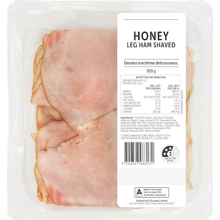 Pork (82%), Water, Salt, Starch (Potato), Dextrose (Maize), Sugar, Honey (0.7%), Vegetable Fibre, Stabilisers (339, 450, 451), Honey Powder, Vegetable Oil, Food Acid (331), Antioxidant (316), Flavour, Thickener (415), Hydrolysed Vegetable Protein, Preservative (250), Flavour Enhancer (635). Wood Smoked.