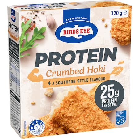 New Zealand hoki (*fish*) (53%), Crumb coating (47%) {water, *wheat* flour, vegetable oil, rice protein, pea protein, pea flour, Southern Style seasoning (0.5%) (garlic powder, onion powder, peppers (black, white, cayenne), paprika powder, salt, herbs, yeast extract, mustard powder), *oat* fibre, *wheat* starch, salt, dextrose, rice flour, maize starch, *wheat* gluten, yeast, burnt sugar, garlic powder, black pepper, onion powder, *barley* malt flour, colour (paprika oleoresins)}.