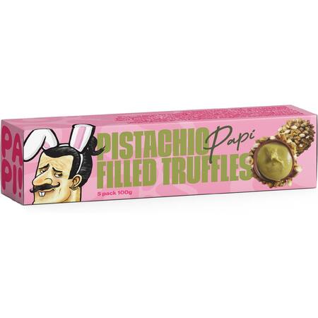 Pistachio Papi (35%) [Vegetable Oil (Sustainably Sourced Palm), Sugar, Milk Powder, Pistachios, Lactose (Milk), Emulsifier (Soy Lecithin), Natural Flavour, Colour (141)], Milk Chocolate (30%) [Sugar, Cocoa Butter, Cocoa Mass, Whole Milk Powder, Milk Fat, Emulsifiers (322 (Soy), 476), Natural Flavour, Caramelised Pistachios (17%) (Pistachio, Sugar, Glucose, Salt), Biscuit Crumb [Wheat Flour, Sugar, Canola Oil, Glucose Syrup, Malt Extract (Barley), Raising Agent (500), Salt, Flavour].