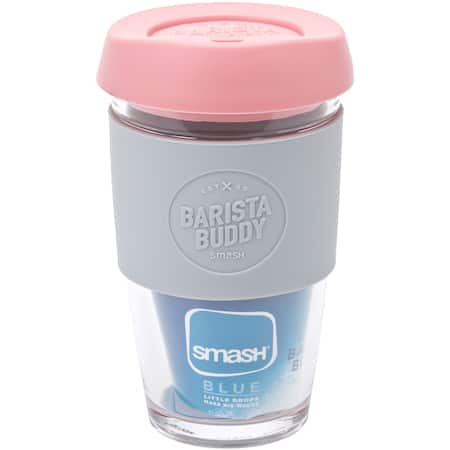 The Smash Blue Barista Buddy is a stylish and convenient reusable coffee cup made from toughened Borosilicate Glass. Features a soft Silicone lid that clicks into place to ensure the perfect seal and sip every time. Comes with a cool-touch Silicone band to prevent hot hands and a comfortable grip. Four colours to choose from.<br>