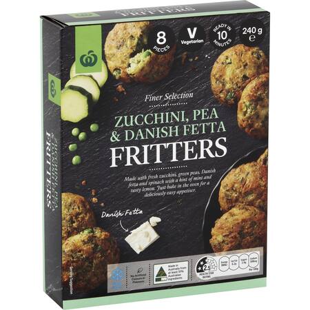 Zucchini (30%), Green Peas (14%), Danish Fetta Che ese (10%) (Milk, Palm Oil, Salt, Starter Culture ( Milk), Non Animal Rennet), Wheat Flour, Spinach (8 %), Rice Flour, Butter (Milk), Egg, Canola Oil, Mi lk Powder, Parmesan Cheese (Milk, Salt, Starter Cu lture (Milk), Coagulating Enzyme), Baking Powder, Mint (0.5%), Lemon Juice (0.5%), Sugar, Salt, Soy Fibre, Black Pepper.