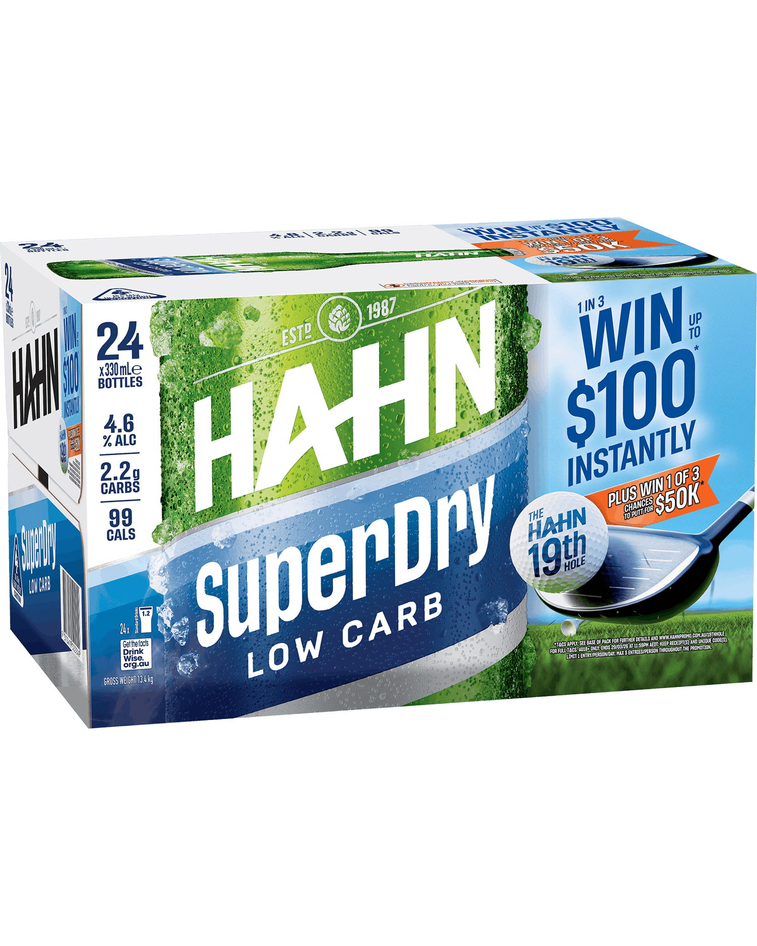 Hahn 19th Hole, 1 in 3 wins up to $100 digital Mastercard instantly PLUS win 1 of 3 chances to putt for $50k. Offer ends 29/03/26. See Base of carton to enter T and C's apply. What happens when you mix four mates, a round and a hunch? Born over 20 years ago with the dream to brew a better beer for modern Australians. Hahn SuperDry, Low Carb Lager uses modern brewing technology and the finest ingredients brewed longer to create a signature SuperDry crisp taste that’s big on refreshment, yet low on carbs. Great Taste. Low Carb - How Good!