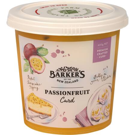 Sugar, passionfruit pulp 18%, water, NZ eggs 8.5% (whole eggs, egg yolk), NZ butter 8% (cream, salt) , lemon juice from concentrate, thickener (modifie d maize starch), salt, natural flavour, natural co lour (beta carotene), emulsifier (433), green tea extract (a natural antioxidant to keep it fresh). CONTAINS EGG, MILK