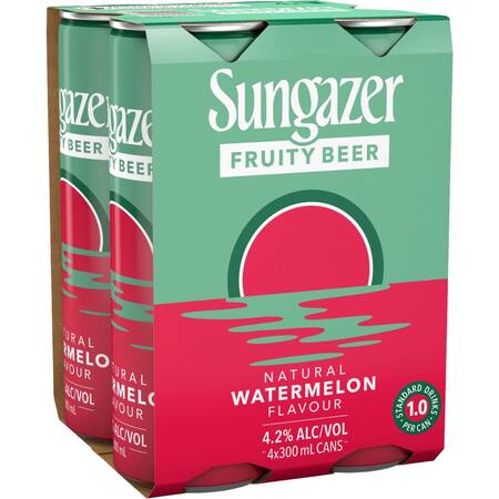 Get Sungazer Fruity Beer Natural Watermelon Flavour Can 300ml x 4 Pack delivered to your doorsteps in minutes | NZ