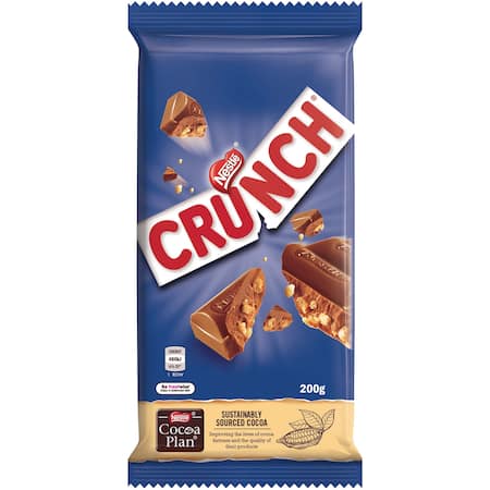 Snap off a piece of Nestle Crunch Milk Chocolate block. The ultimate textural combination of ultra-crunchy, crisp rice pieces packed into smooth milk chocolate. •Made with 100% certified sustainable cocoa, supplied through the Nestle Cocoa Plan•Recycle me! Return your wrappers in store through REDcycle. •Proudly made in our Australian factory, in Campbellfield, Victoria. •Suitable for vegetarians.