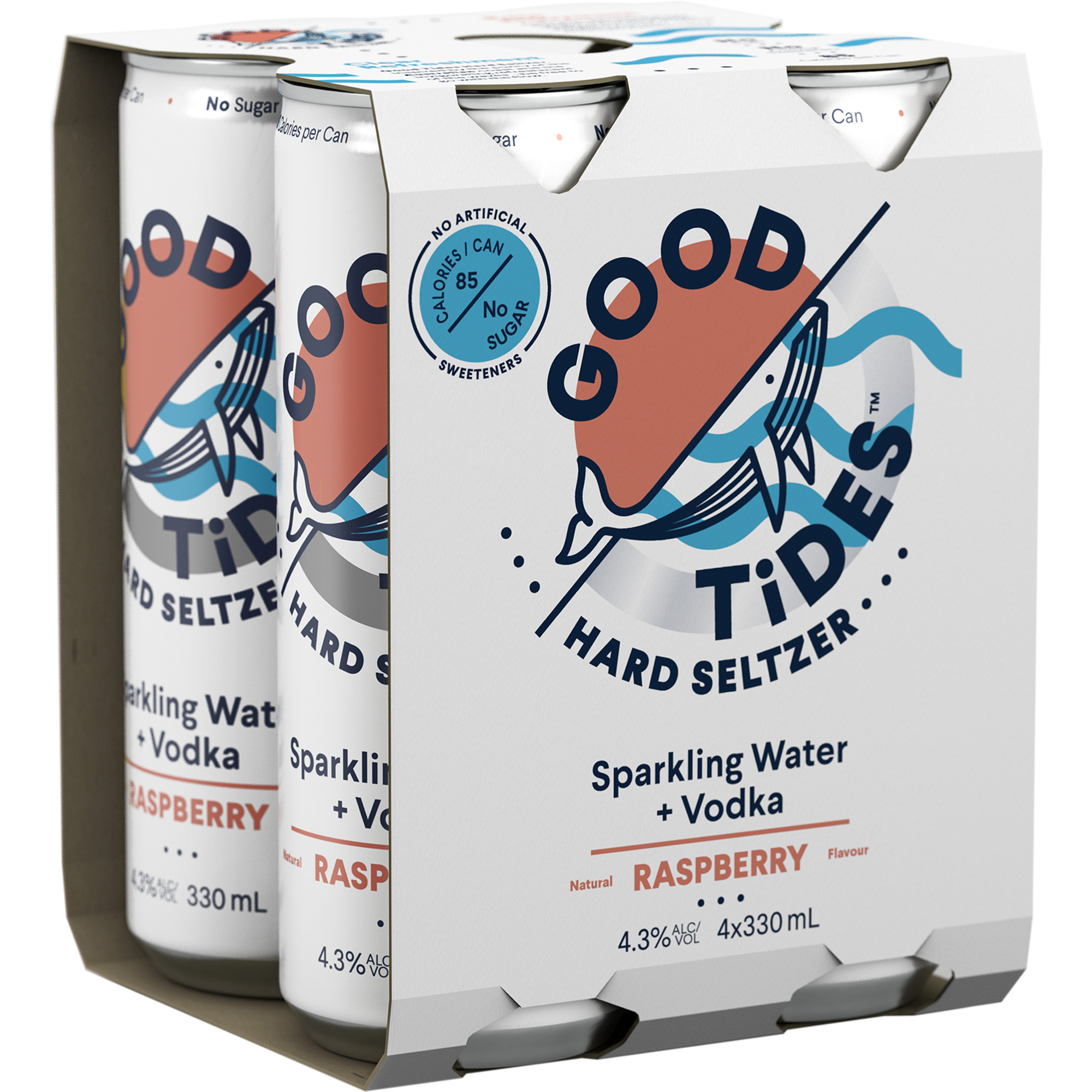 Bring on the good times with Good Tides Hard Seltzer. Luscious Raspberry sparkling water and vodka. With no sugar, and only 85 calories per can, what more do you need?