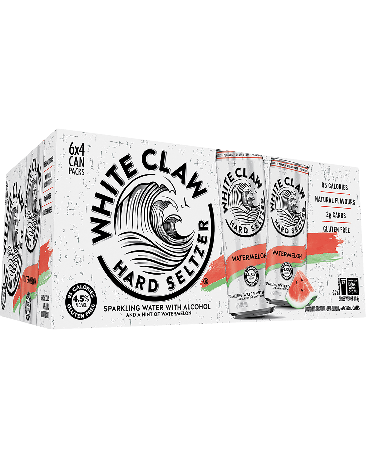 Delight in the taste of fresh Watermelon.White Claw Watermelon,madewith sparklingwater,triple distilledspirit and a hint of natural Watermelon flavour todeliverawaveof purerefreshment likeyou’ve nevertastedbefore.
