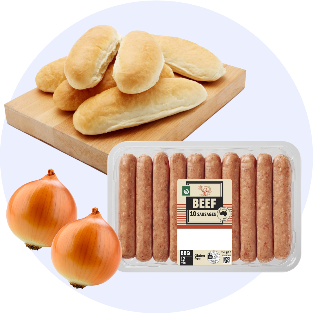Juicy butcher’s sausages, soft rolls, and sauces for the ultimate backyard barbecue classic.